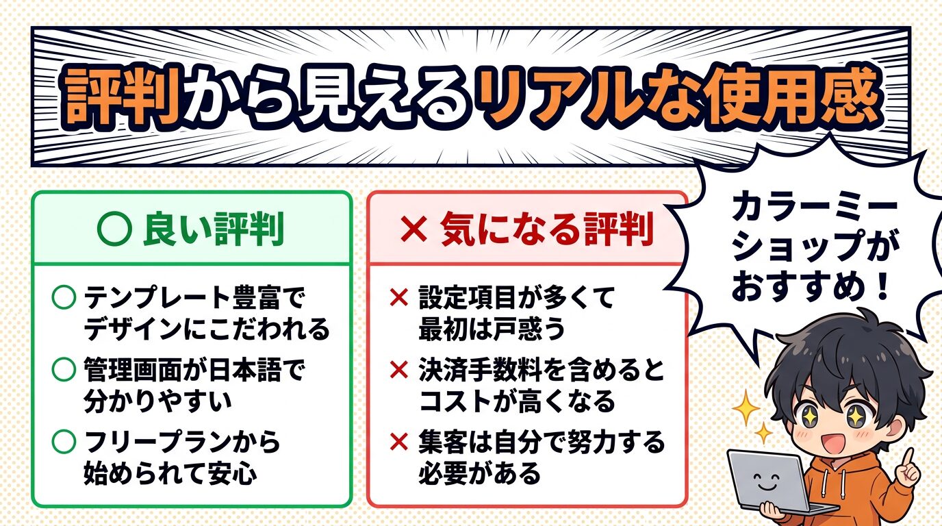 結論としては、「国内向けのネットショップを本格的に、かつ費用を抑えて始めたい人」にはカラーミーショップは有力な選択肢です。一方、とにかく手軽さ最優先ならBASEやSTORES、海外展開ならShopifyなども比較検討する価値があります。