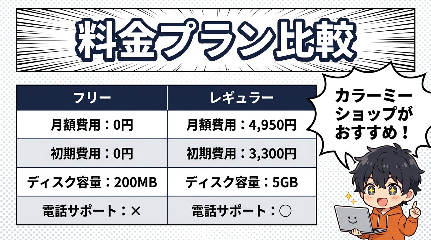 - 月額費用をできるだけ抑えたい? → Yes ならフリープランが候補
