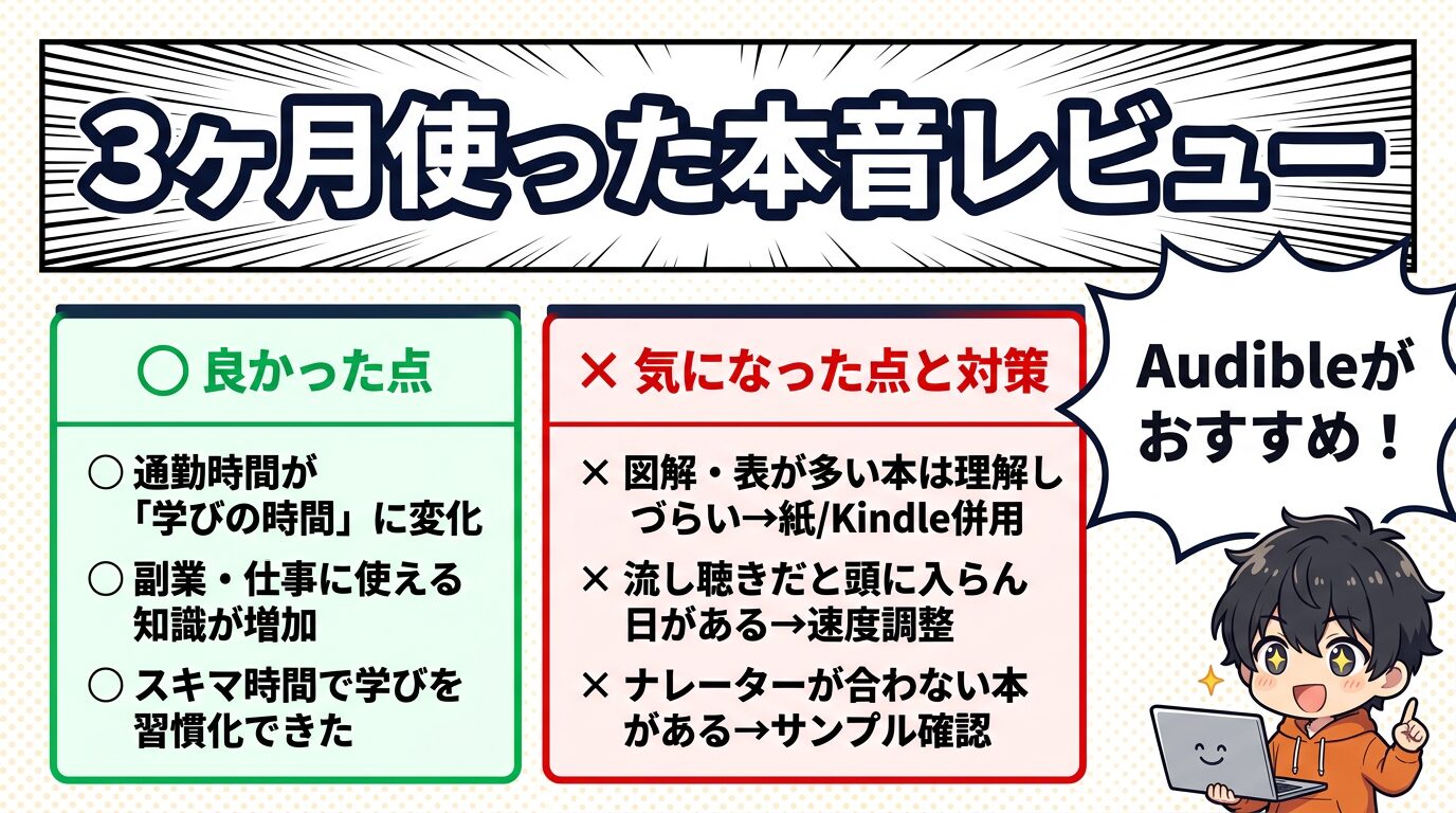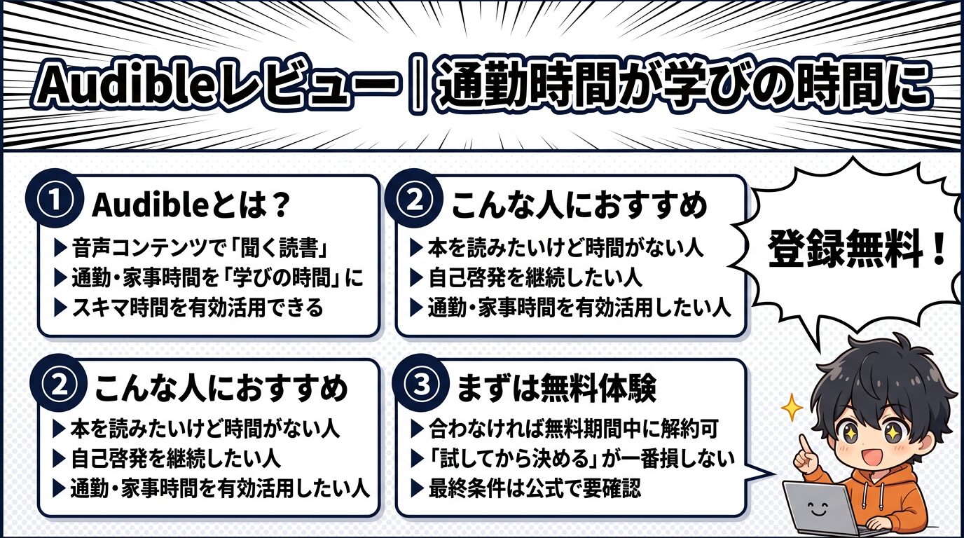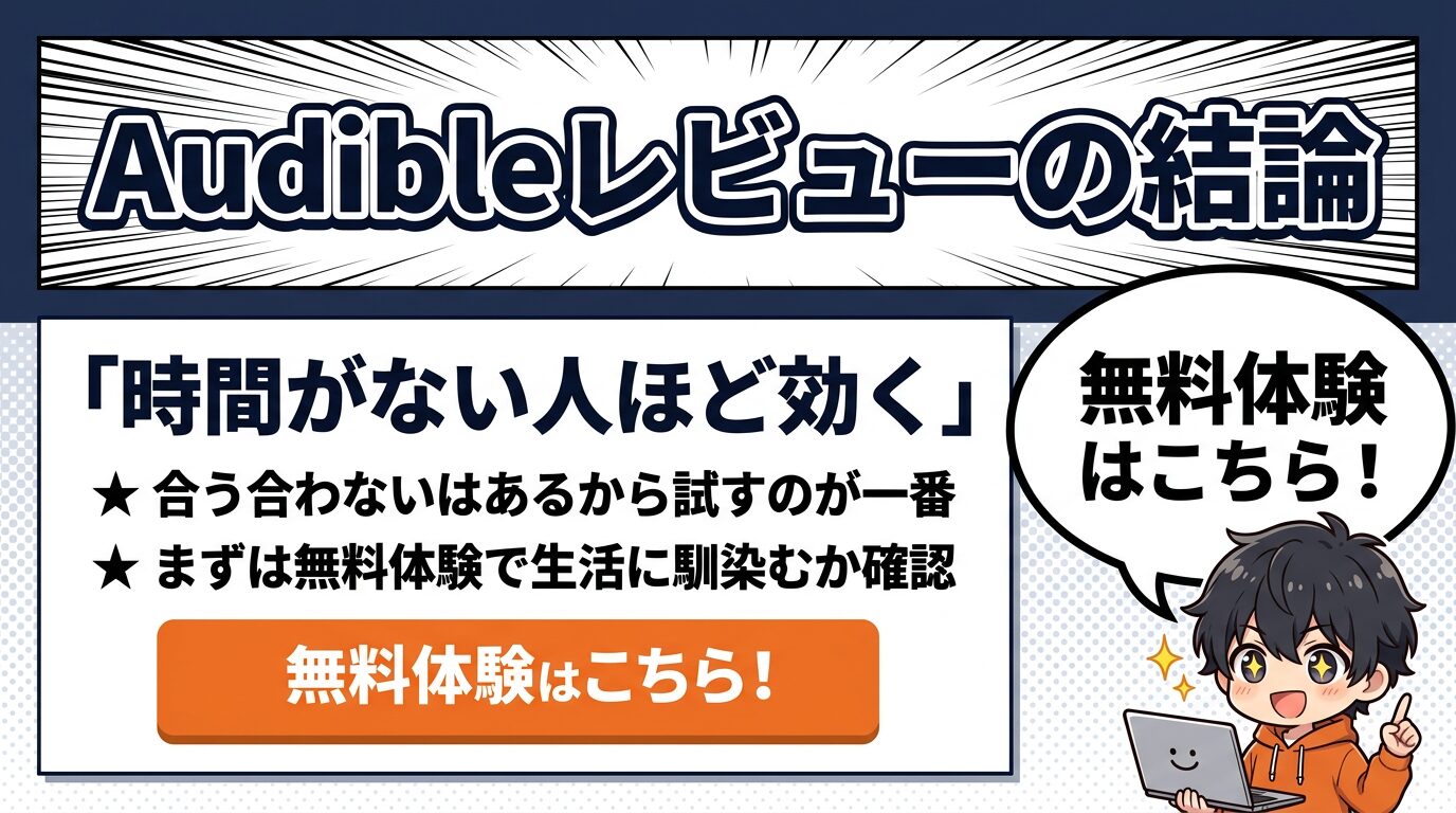 Audibleレビューの結論はこれ。「時間がない人ほど効く」。 ただ合う合わないはあるから、まず無料体験で“生活に馴染むか”だけ確認するのが一番ムダがない。