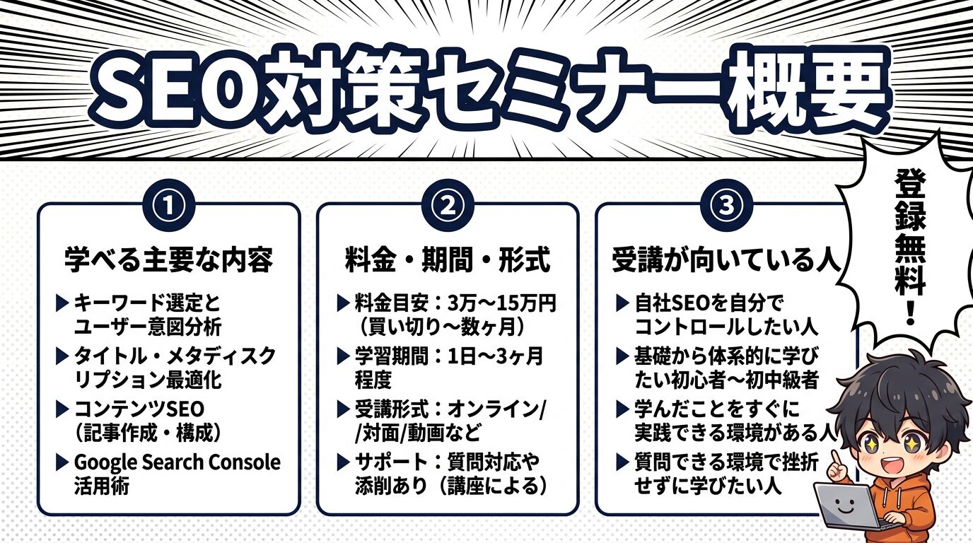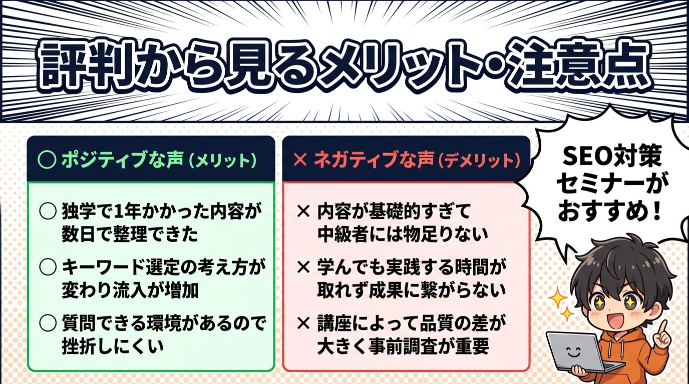 この記事では、SEO対策セミナーの内容・料金・評判を整理し、受講すべき人とそうでない人を明確にします。