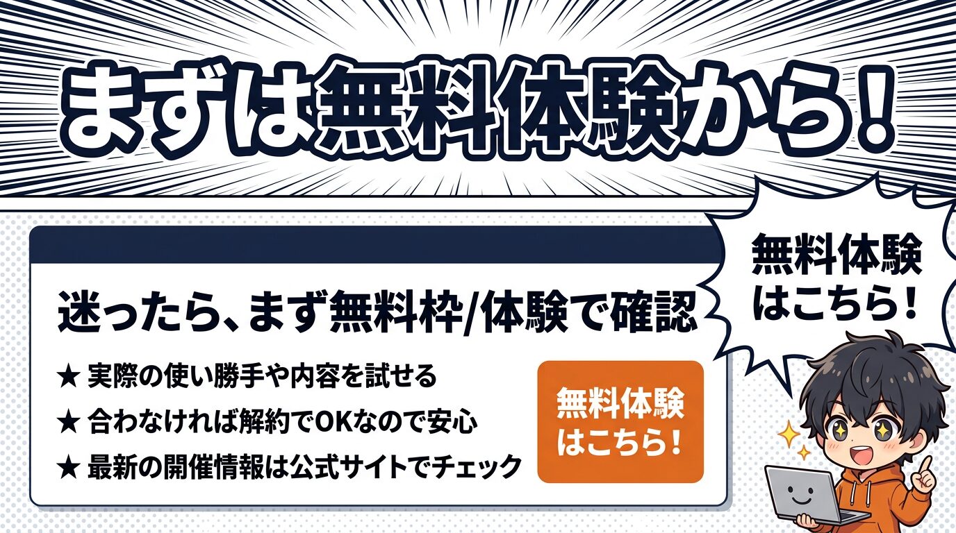 迷ったら:まず無料枠/体験で使い勝手を確認 → 合わなければ解約でOK。