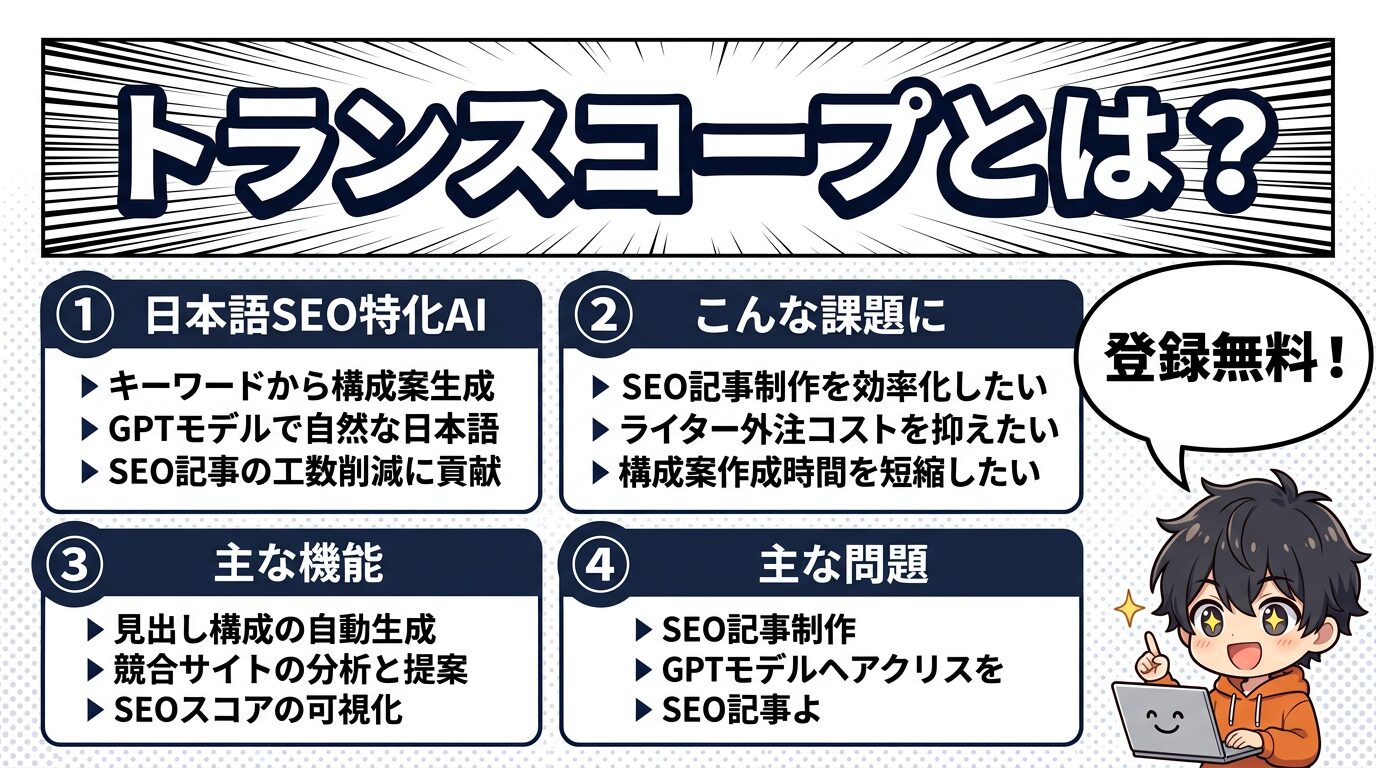 AIを活用してSEO記事を効率的に作成したい――そんなニーズに応えるライティング支援ツールが注目を集めています。本記事では、AI文章作成サービス「トランスコープ」の機能・料金・評判を整理し、あなたに合うかどうかを判断できるようにまとめました。