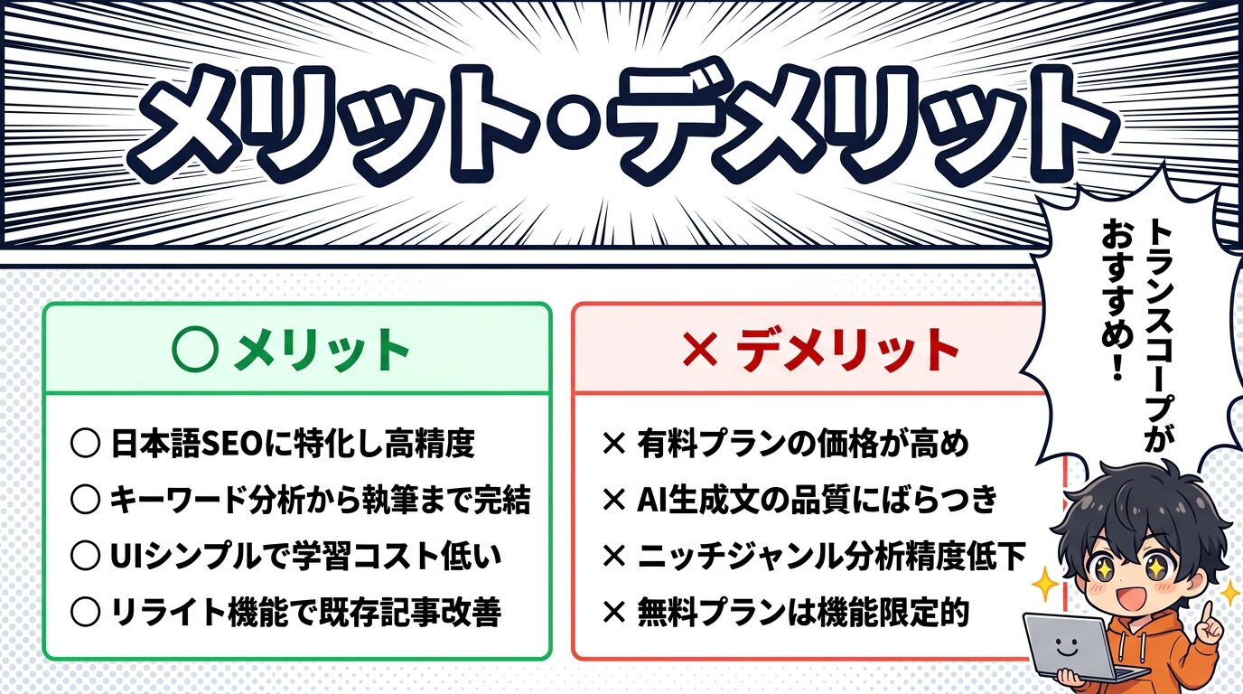 「月5本以上のSEO記事を安定して制作したい法人・チーム」にはトランスコープは有力な選択肢です。特に構成案の作成と競合分析にかかる時間を短縮したい場合、コスト以上のリターンが見込めます。