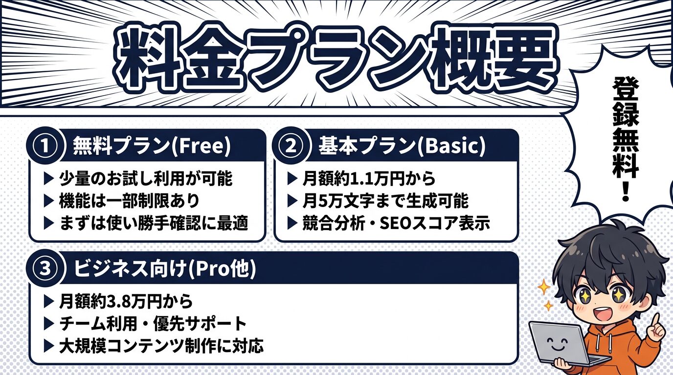 一方、記事制作の頻度が低い個人ブロガーや、AIに丸投げしたい方には割高に感じる可能性があります。まずは無料プランかお試し期間で使用感を確かめてから、有料プランへの移行を判断するのが堅実です。